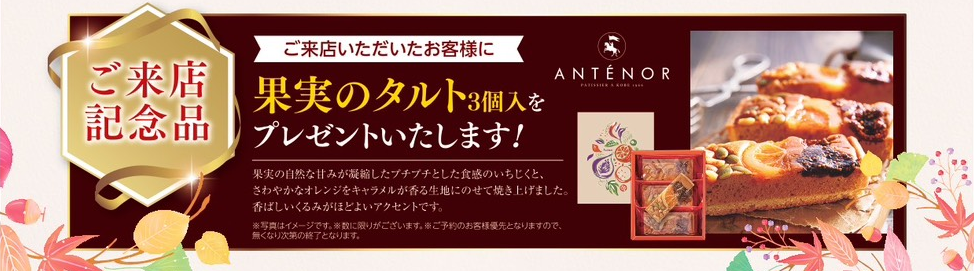 また、ご来店いただいたお客様に「ANTENOR」の果実のタルトをプレゼントいたします。